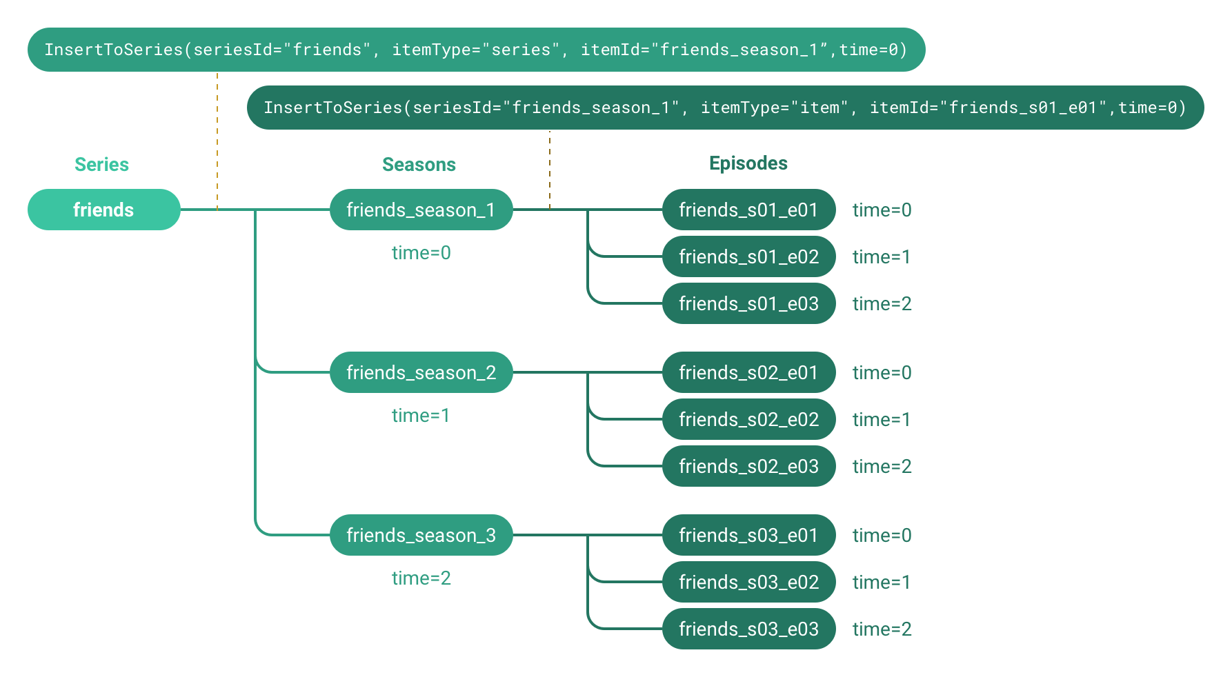 The hierarchy can be either one-level (series → episodes) or multi-level (series → seasons → episodes), depending on the structure of your content.