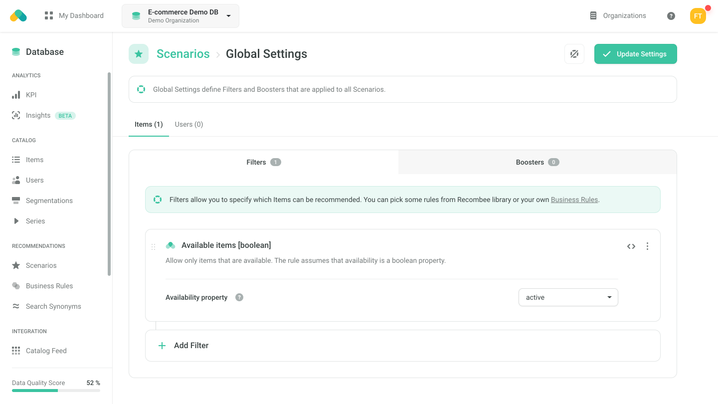 You can select a predefined rule from the Recombee Library to allow only the available products.